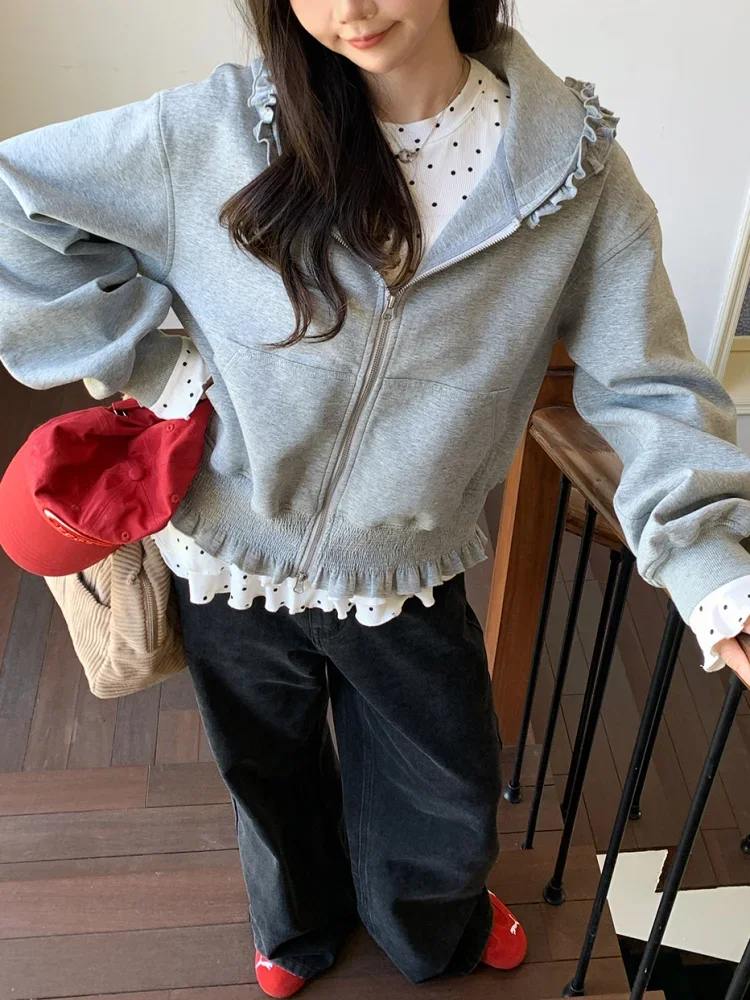 Korean Pink Zip Hoodie Women Ruffle